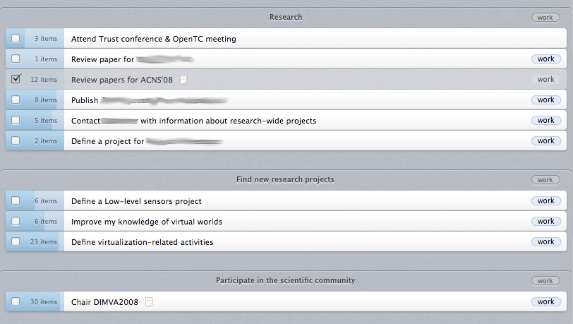 - I try to make sure that every task and project I create fits in one of the Areas I have defined. These are supposed to be all the “high-level functions” in my life, and if one task does not fit in any of them, then either the task is unimportant or there is an area that I have overlooked so far. Areas cover everything for both work (”Write papers”, “File patents”, “Research”) and personal life (”Family life”, “Health”, “Home and car maintenance”), as well as areas that cover both work and personal items (”IT infrastructure maintenance”, “Blogging”, “Productivity”).