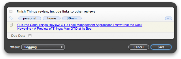 One feature that I find very useful is the ability to drag any link into the notes field, and Things will recognize it correctly. This obviously includes URLs from Safari, but you can also drag email messages, files or folders, and Journler entries. This makes it possible to have at your disposal any relevant information you need to do it. When you click on the links, the corresponding item in the correct program will open.