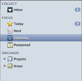 This subdivision is the only fixed structure that Things will impose upon you. Inbox is where you collect your stuff as it appears (although you can also file it directly in some of the other areas), Today is where tasks that you have marked as “must do today” appear, Next is where all your future tasks are listed, Someday are things that you have left for some undefined time in the future (this is GTD’s “Someday/maybe” list), and Postponed is things that you have left for some defined time in the future (this is an electronic tickler file).