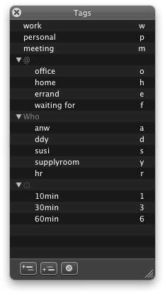 Using the Things tag bar, you can quickly filter any of the views to see only the appropriate tasks. You can assign one-key shortcuts to tags, so you can quickly add and remove tags to tasks by pressing them while the task is selected. You can also apply tags to projects and areas.